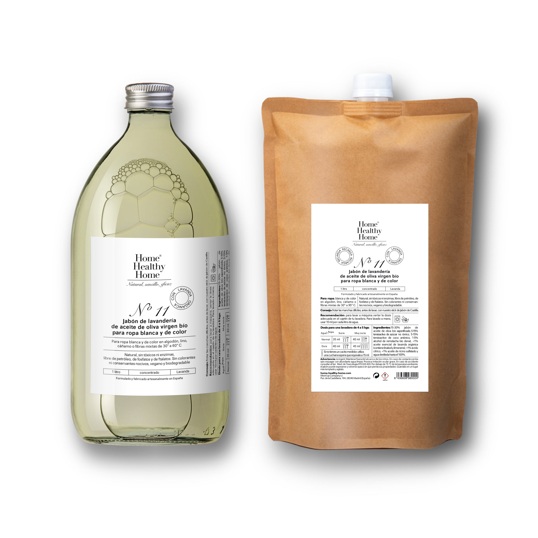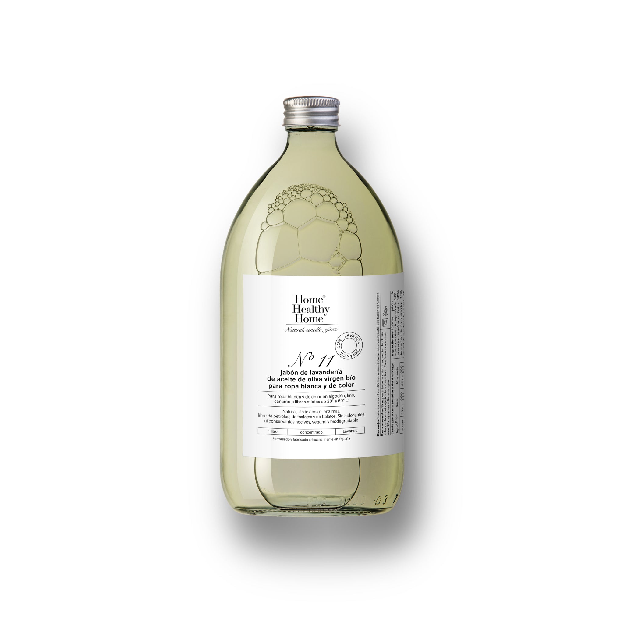 Our naturally derived concentrated laundry soap with organic olive oil and organic lavender for all types of garments, from whites to mixed fibers. Effective from 30°C. Formulated without harsh chemicals, 100% biodegradable, leaving a gentle fragrance of organic Spanish lavender. Free of enzymes, microplastics, GMOs, petroleum derivatives, and dyes, this soap cleans deeply without the need for fabric softener, preserving colors and eliminating bacteria. Suitable for hand washing and HE washing machines.