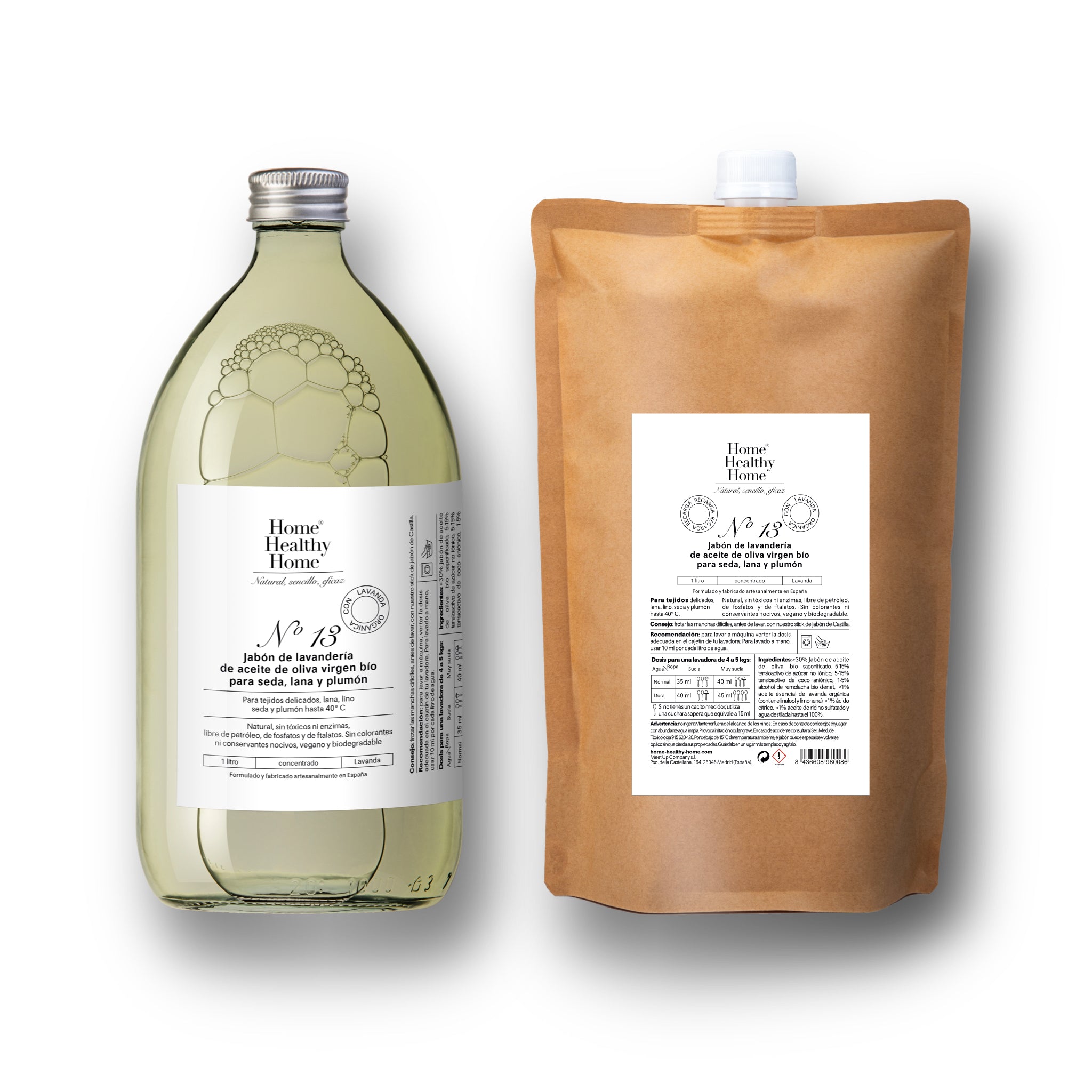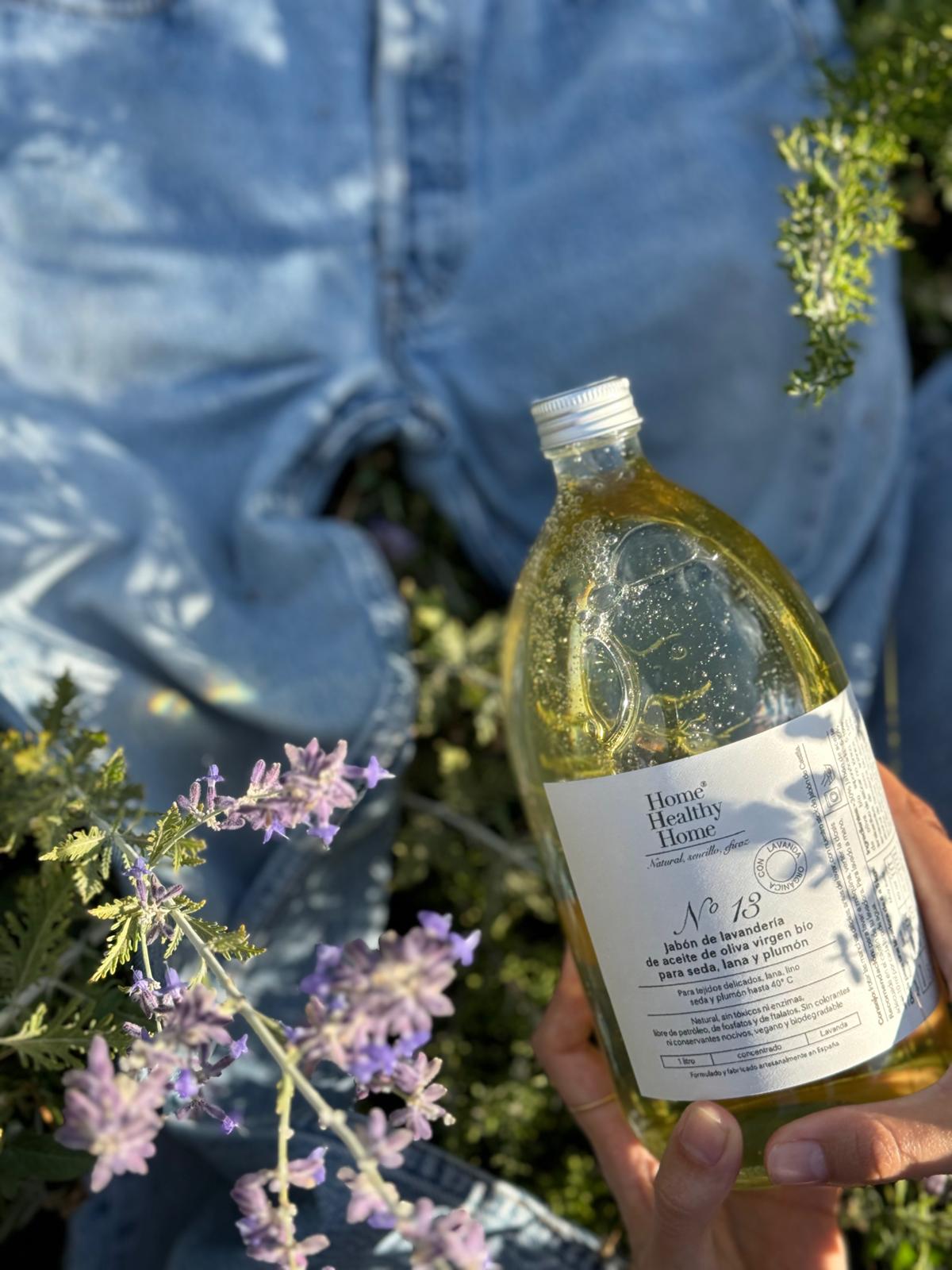 Our laundry soap with organic olive oil is specially formulated for washing delicate garments such as Silk, wool, cashmere, linen, merino wool, mohair, angora , down, etc. Cleans, nourishes, and moisturizes, preserving the softness, flexibility, and shine of natural fibers and increasing their longevity. Effective from cold washes up to 60°C, it is ideal for both hand washing and HE washing machines, without the need for fabric softener . Made without enzymes, GMOs, petroleum derivatives, microplastics, or harmful preservatives, vegan and biodegradable. Scented with the delicate fragrance of lavender essential oil certified organic Spanish farming.